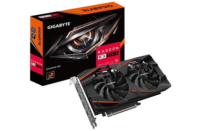 The GIGABYTE Radeon RX 580 isn’t the cheapest among its competitors, but it’s still an excellent budget pick for gamers. While other graphics cards come with basic designs, this one will fit your gaming aesthetic because it has a trendy design with built-in RGB lighting that is fully customizable. The graphics card’s core clock reaches 1340 MHz using gaming mode and 1355 MHz in OC mode. It features 8 GB of graphics RAM, and it has a memory clock speed of 8000 MHz. The Radeon RX 580 has GIGABYTE’s WINDFORCE 2X system, so you can expect it to manage heat well. Its unique fan blade design has 3D stripe curves and a triangle edge to help airflow. The GPU’s direct contact care is maximized through its three uniquely-shaped copper heat pipes. These heat pipes balance phase transition and thermal conductivity well, resulting in the card having a better cooling capacity. It’s easy to tell when the graphics card’s fans are active or not because they come with LED indicators.