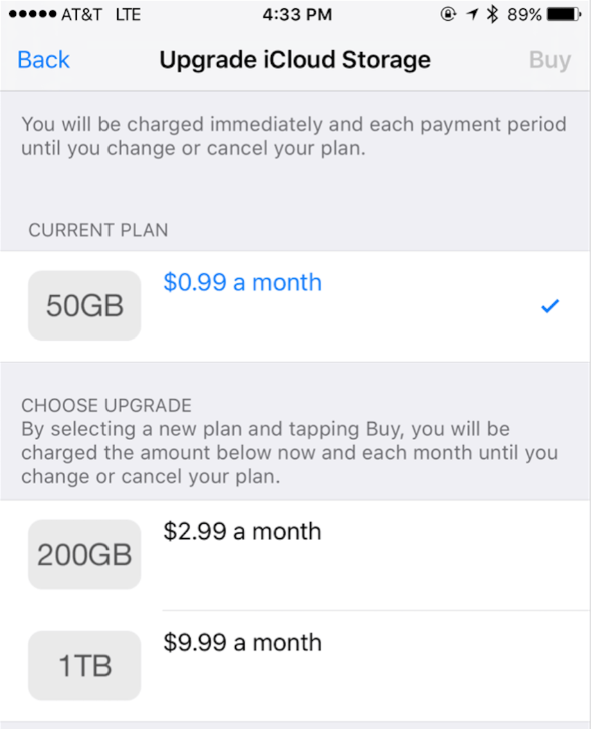 For the most part, the next step up from where you are will make the most sense, obviously, so if you’re on a free account, pick the 50GB plan, and so on. Then your device will walk you through the payment process, and that’s it. No more failed backups!