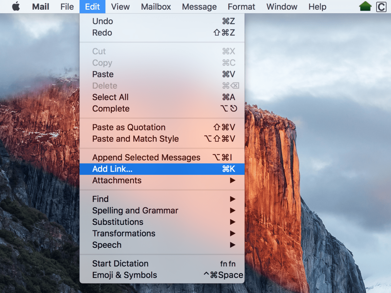 Then choose Edit > Add Link from the menus at the top of your screen, or use the keyboard shortcut Command-K.