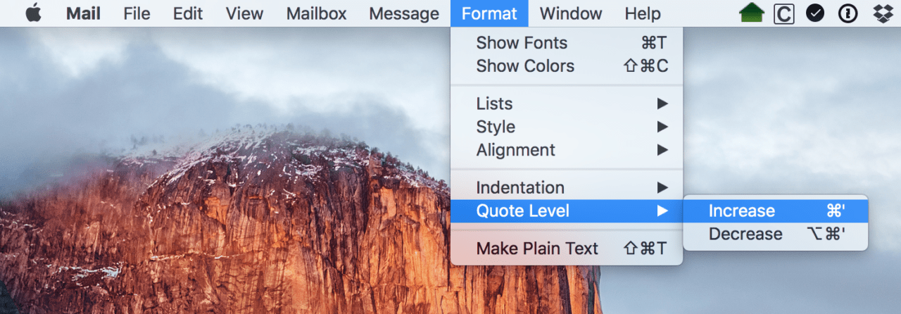 Users can manually format body text in a rich text email message to allow quoted selections to stand out, but Apple Mail includes a Quote Level feature which can quickly do this for you. Using unique formatting for quoted text can make your emails clearer by visually differentiating your words from those sourced elsewhere. To use this feature, first select the text you’ve pasted or are quoting, and then choose the Format > Quote Level > Increase option.