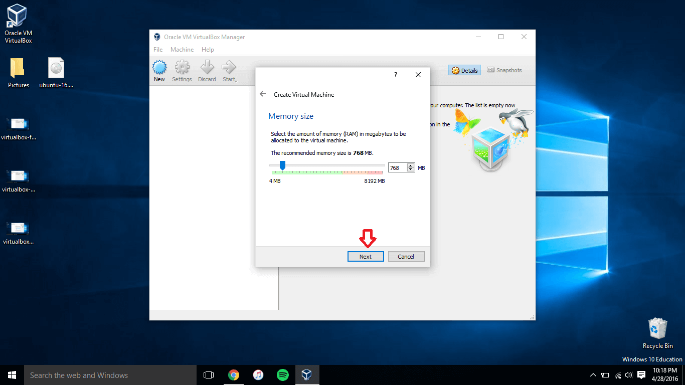 Once you’re finished deciding, press Next. The next screen (pictured above) will ask you how much memory you want to allocate to it. Usually the recommended is a good option to go with, but you can allocate more if you so desire. After you’ve set it, press Next again.